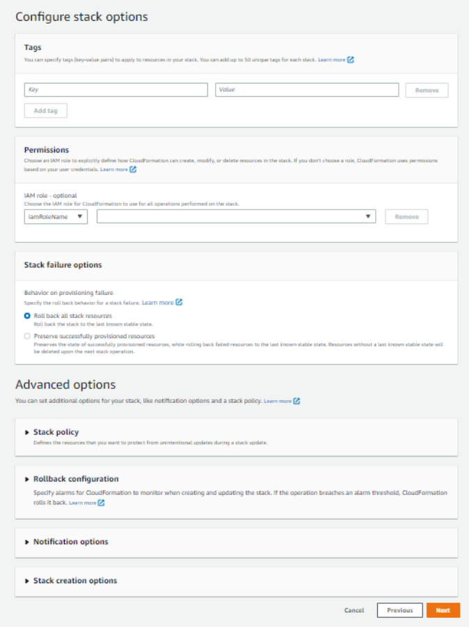 3. In the Stack Failure Options field, choose Roll back all stack resources, and click Next.